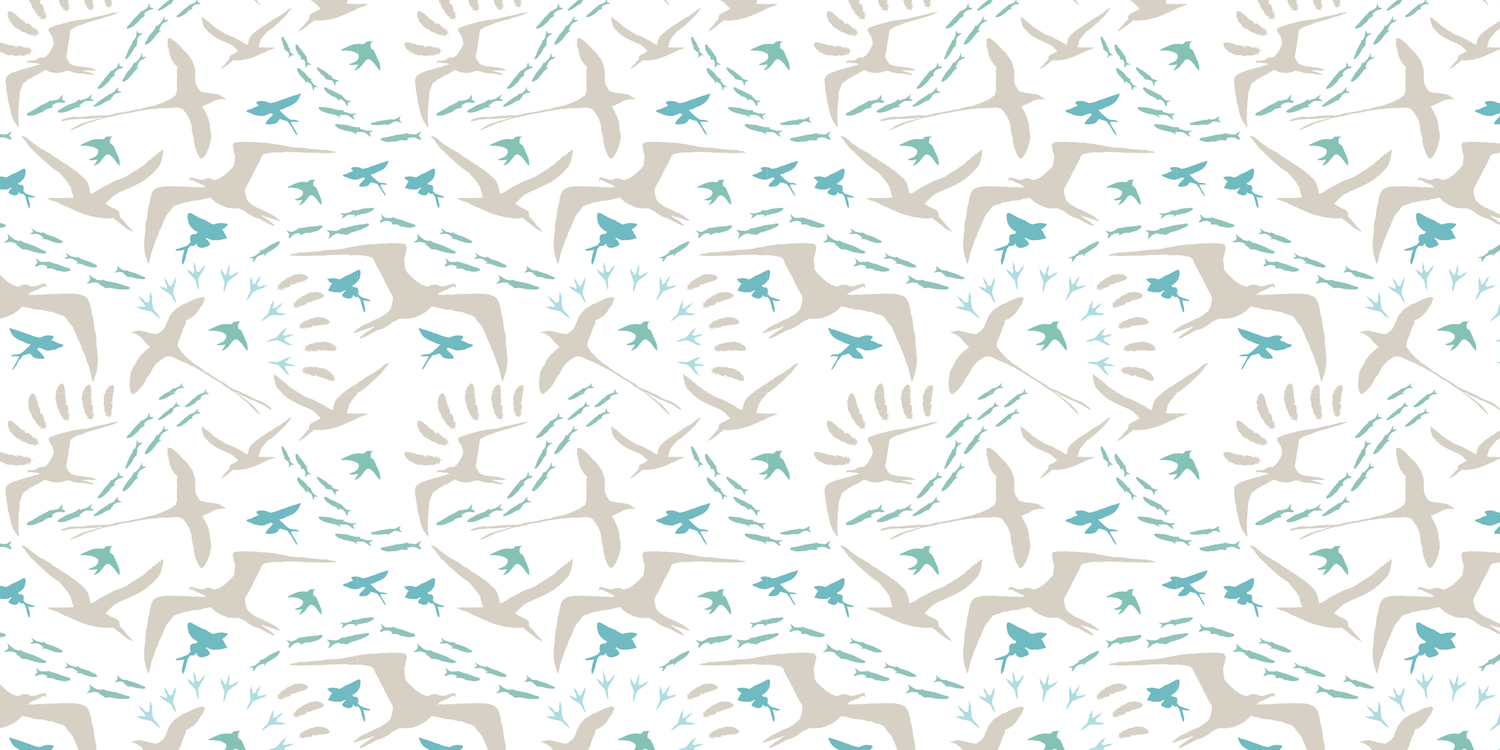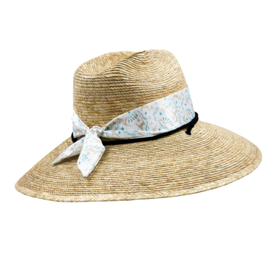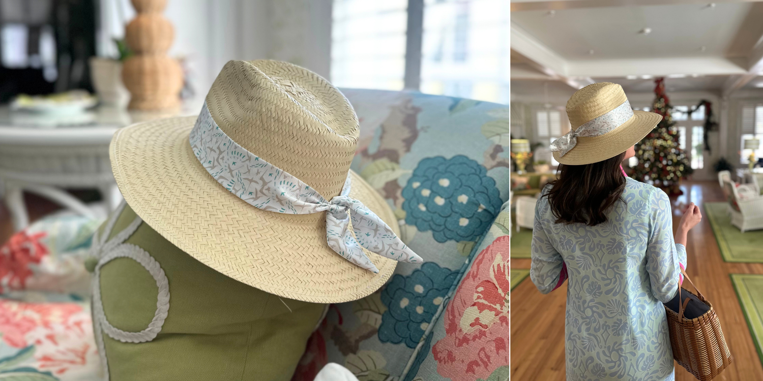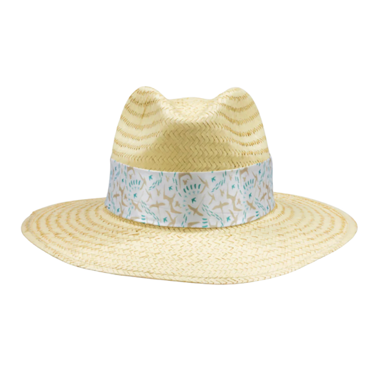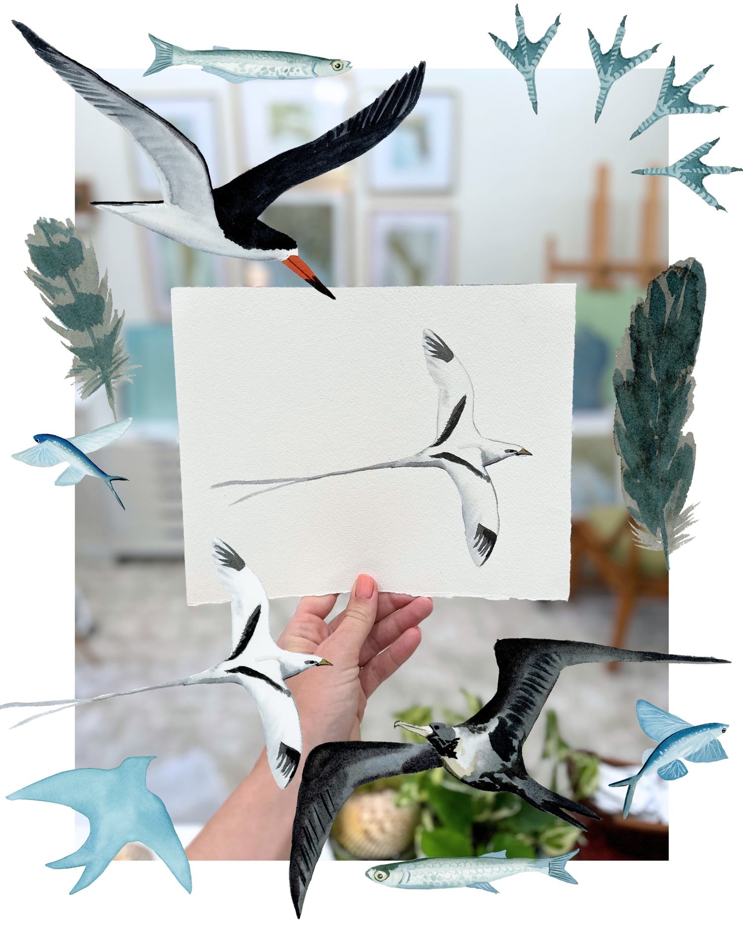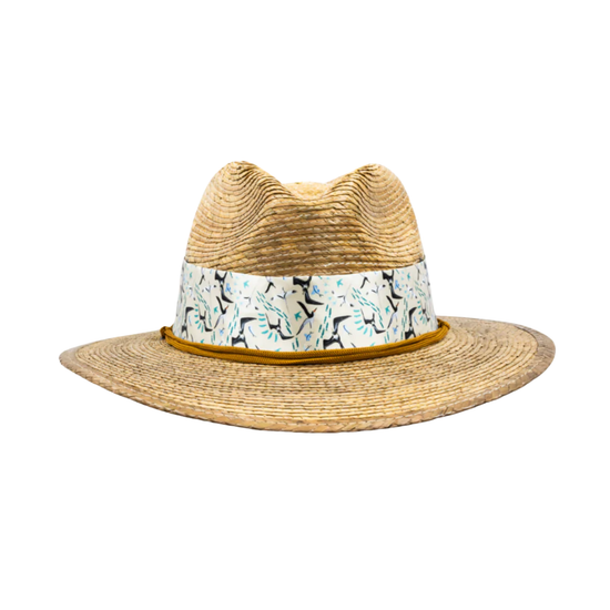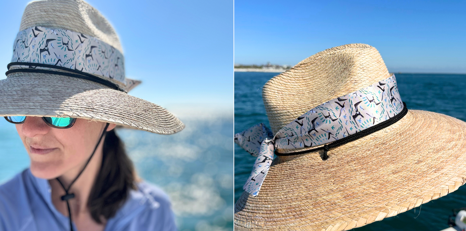 Introducing coastal hat twillies featuring custom hand-painted designs from artist Lindsey Simonds. Soaring frigatebirds, gliding black skimmers, white-tailed tropicbirds and flying fish soar among a motif of baitfish and bird tracks.