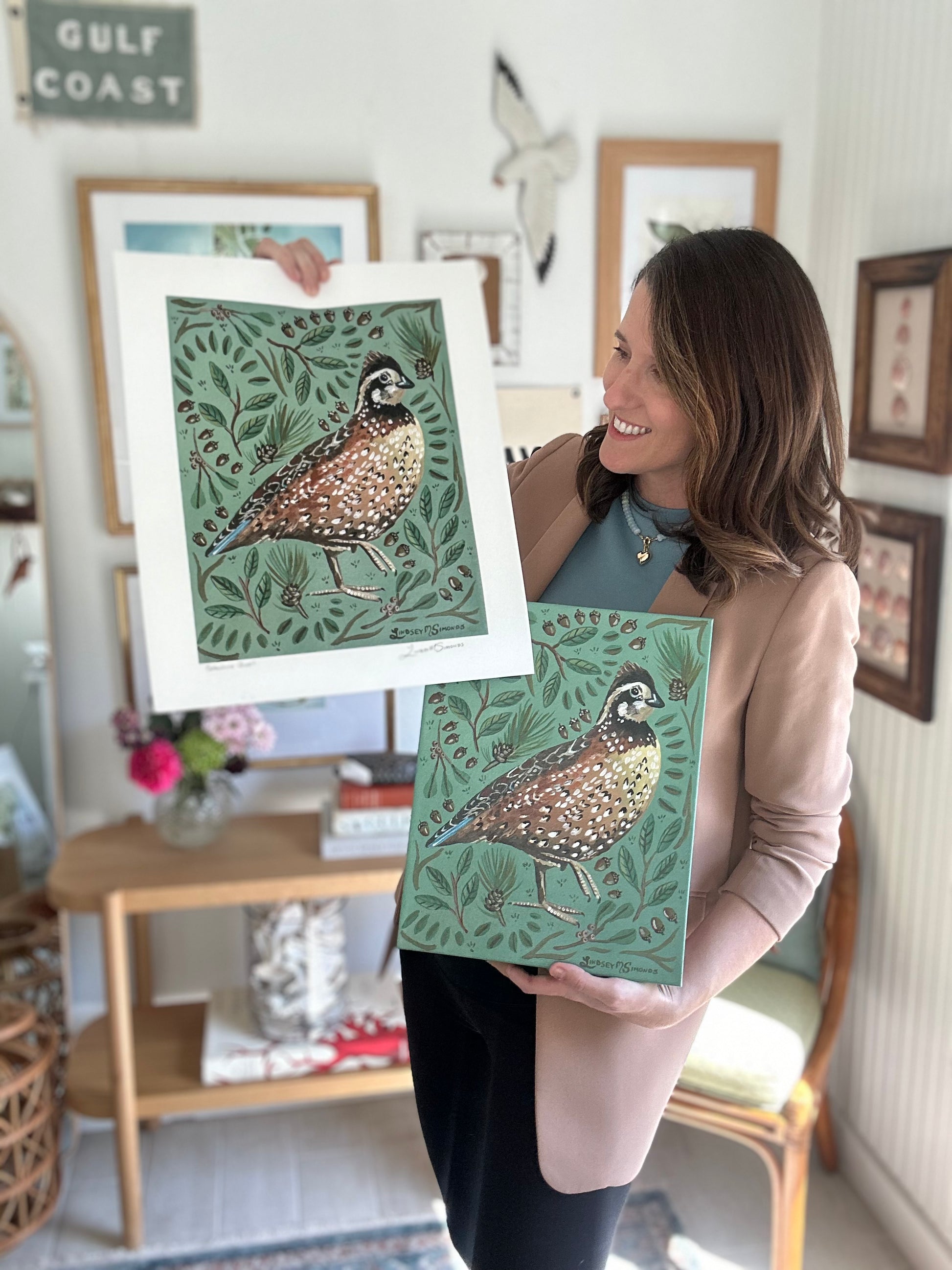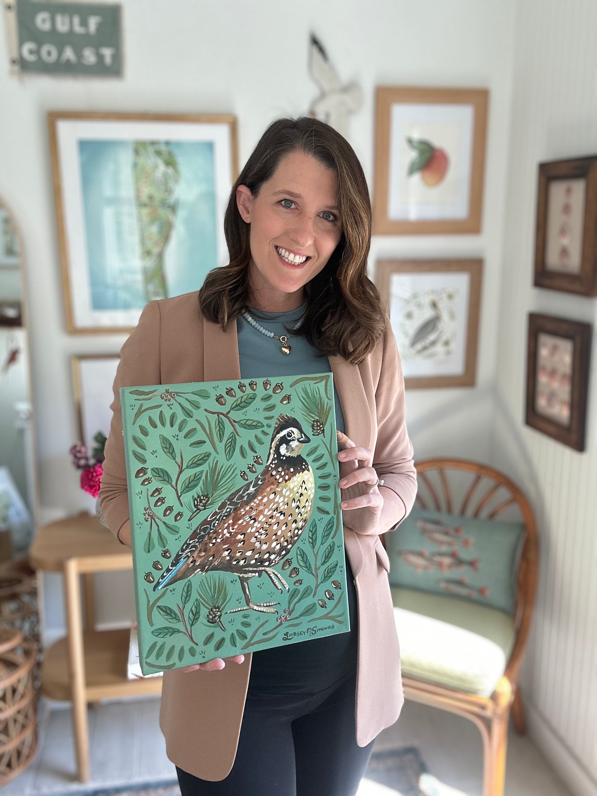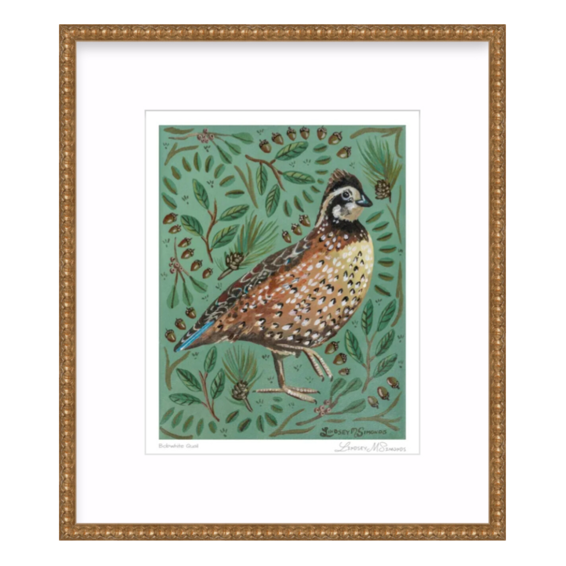 The acrylic Bobwhite Quail painting is the perfect addition to every Southern tastemaker's home and features the bobwhite quail among oak and pine branches on a rich green background.