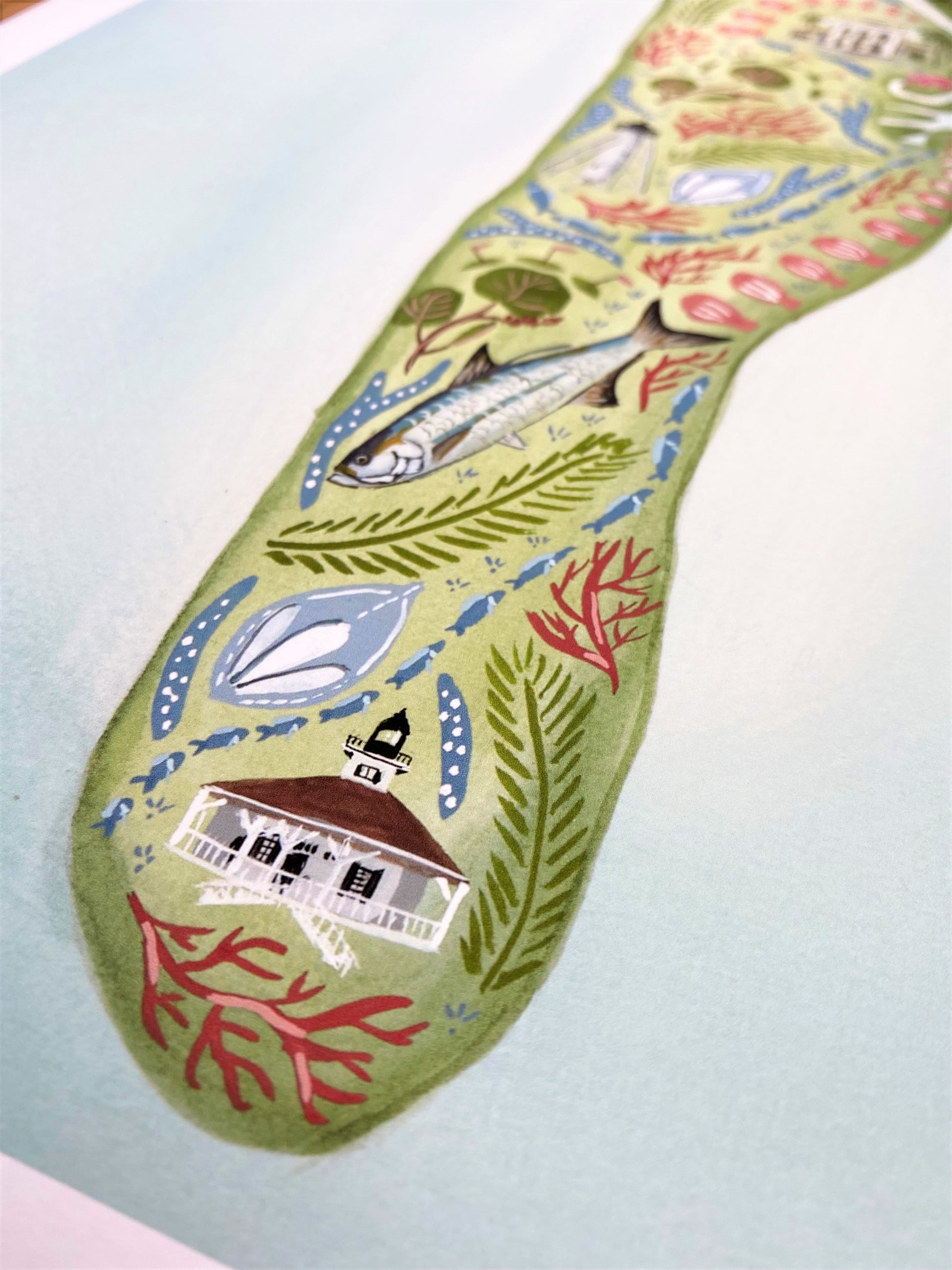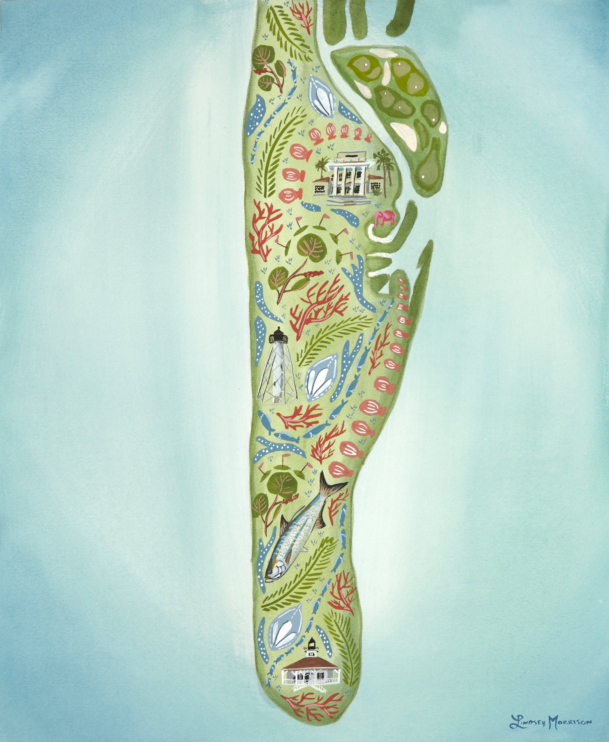 Boca Grande.... the tarpon-fishing capital of the world and dreamy destination for island lovers! My family grew up tarpon fishing along the beaches and in Boca Grande pass, visiting the pigs and goats at beloved Whidden's Marina, and walking under the banyan-lined streets. As an adult, I now have a newfound love and appreciation of this island community, which typically involves golf outfits, rum drinks at the Beach Club and wearing our finest pink dresses at the Pink Elephant! All these elements are interwoven in this classic coastal motif map.