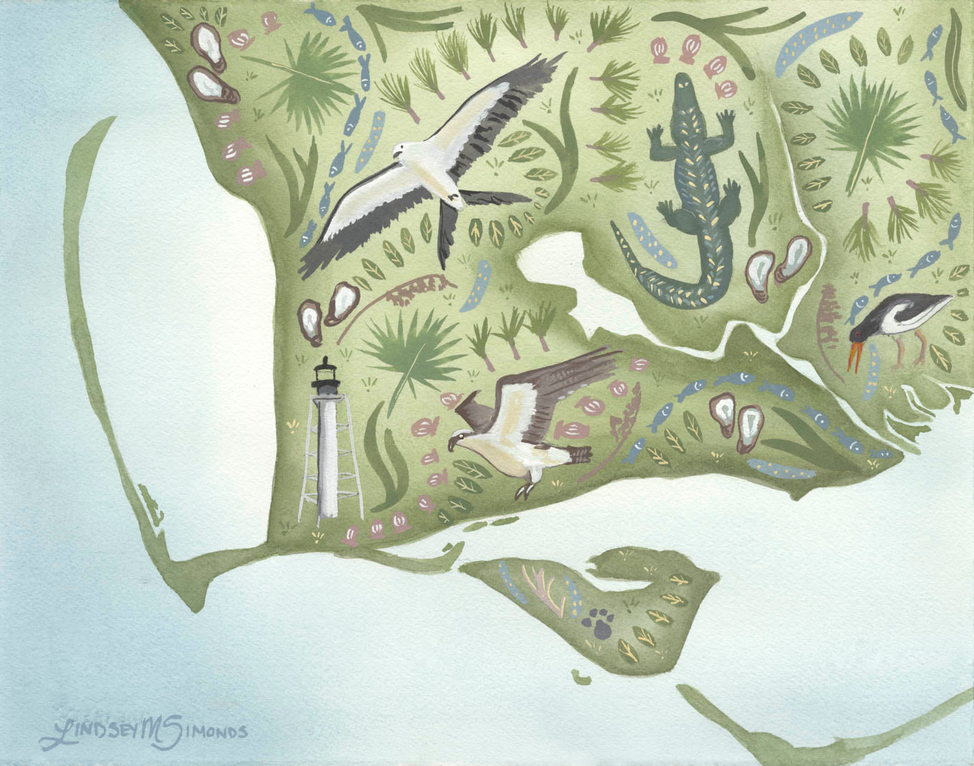 The Cape San Blas coastal map motif mirrors this casual old Florida living while giving a nod to the creatures great and small who call it home.