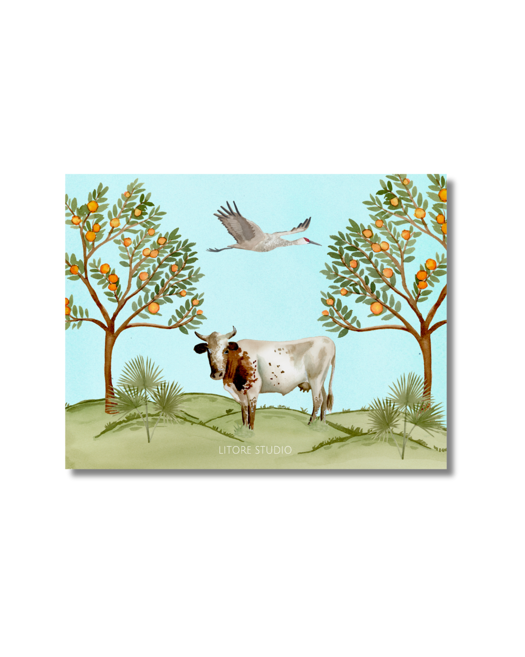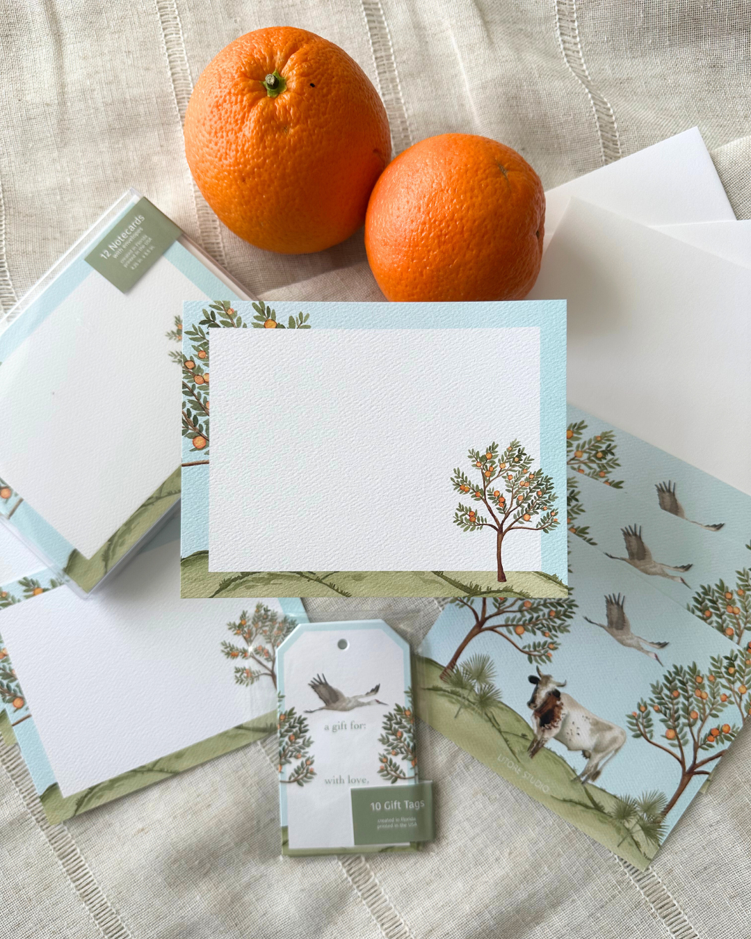 12 Flat Luxe Notecards with a Florida Chinoiserie design reflecting the beauty of Florida's orange groves, sandhill cranes, and cattle industry.