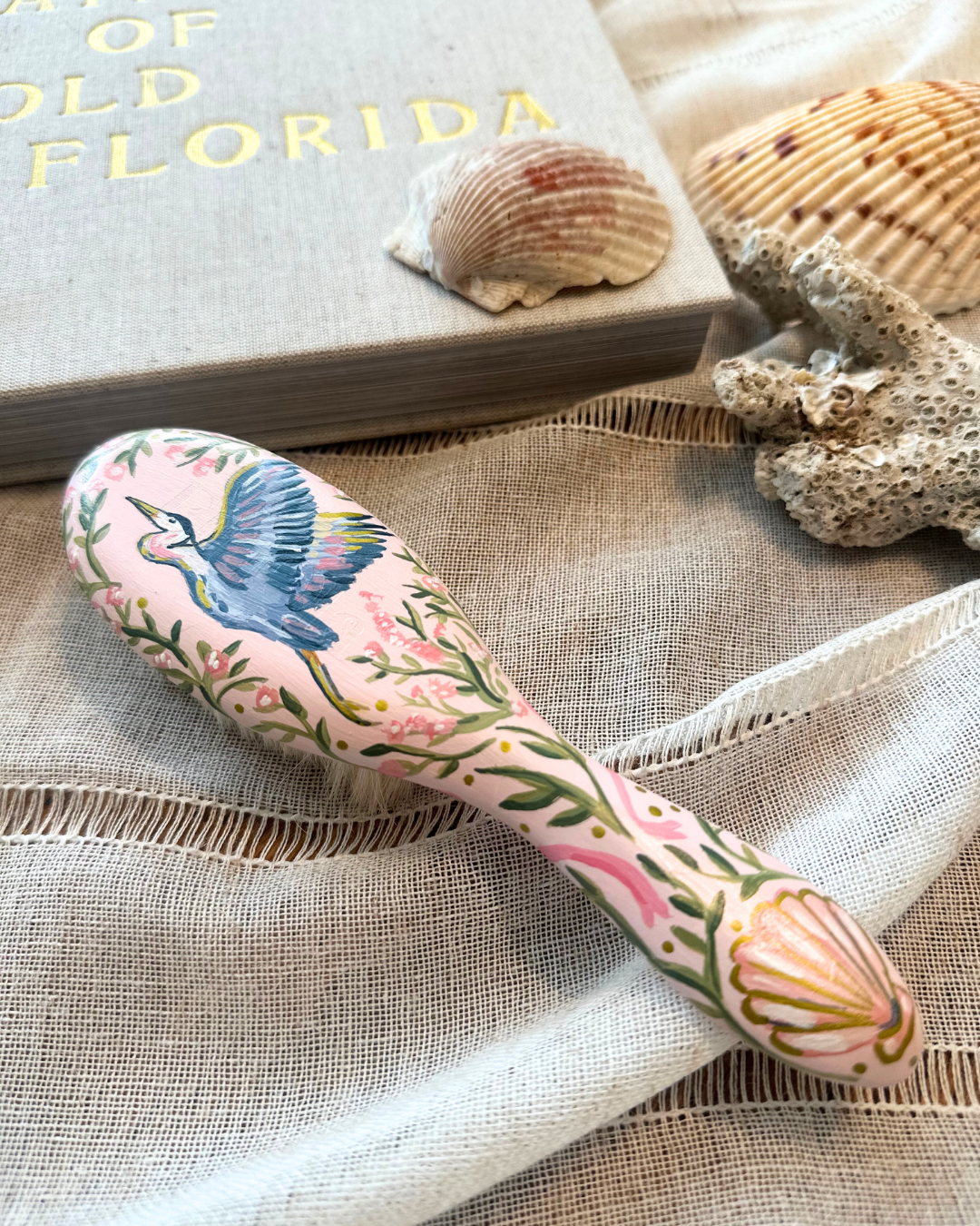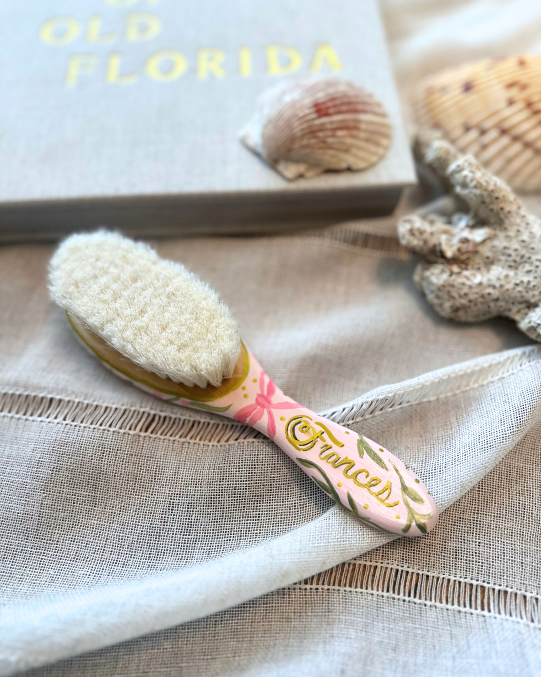 Hand-painted baby brush with a signature Litore Studio design of a Great Blue Heron surrounded by delicate pink blooms and vines, with a coral shell on the handle. Personalized for baby Frances.