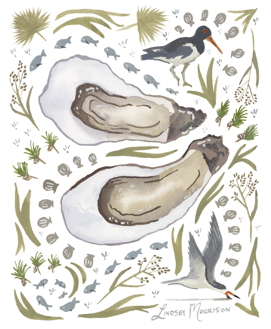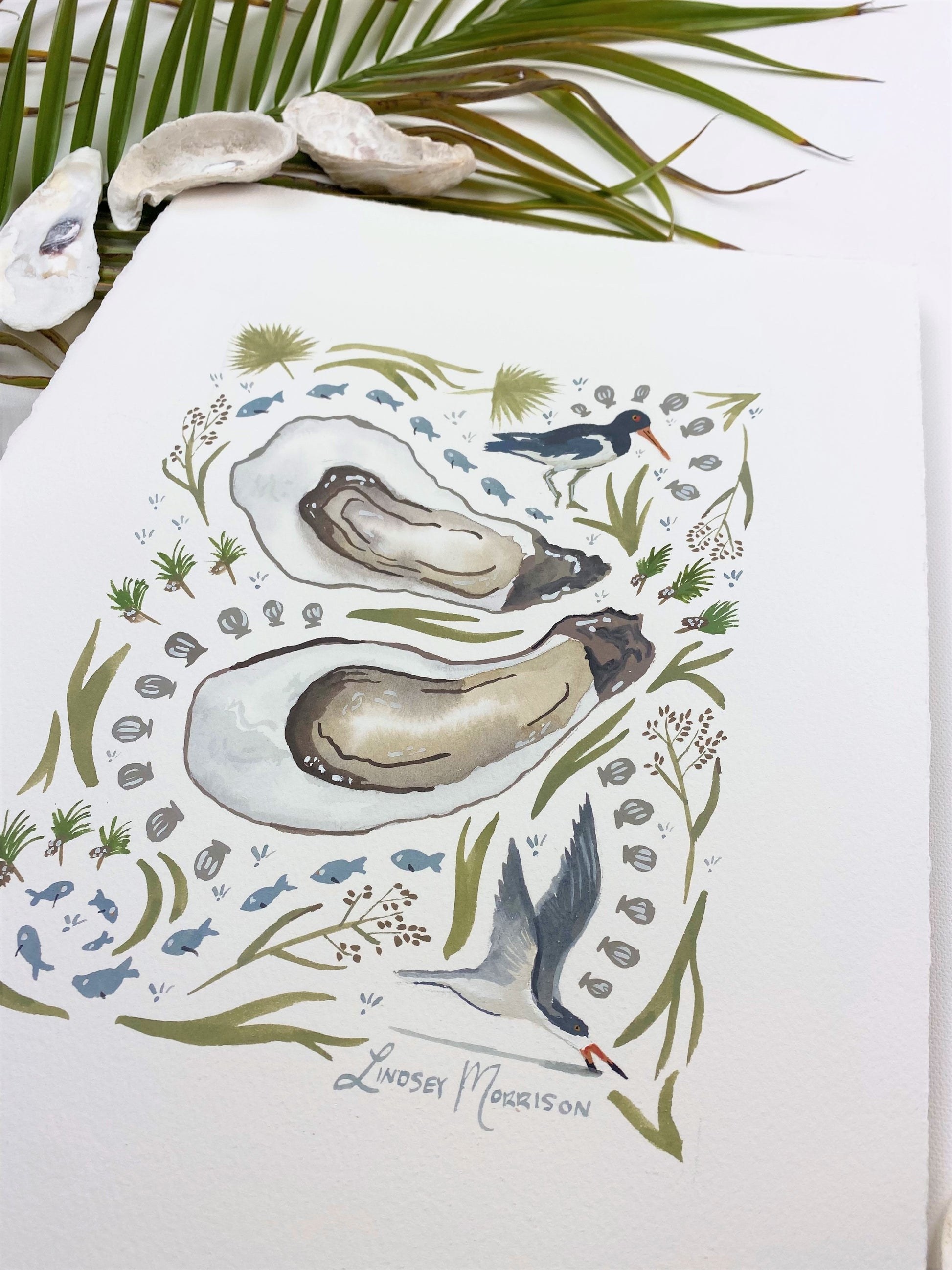 "Half Shell Oysters," the coastal and low country coastal motif that features whimsical half shell oysters surrounded by a rhythm of pines, palms, shells, sea oats, sea grass and an oyster catcher and skimmer.
