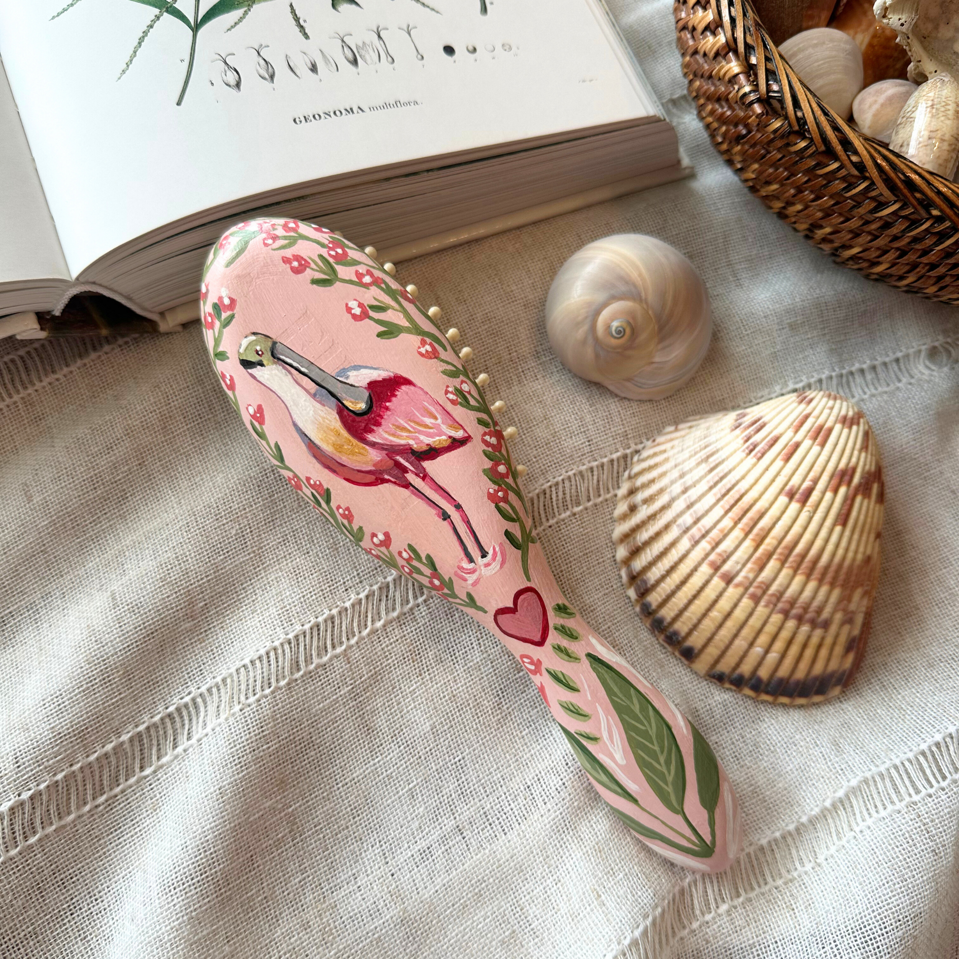 Hand-painted baby brush with a signature Litore Studio design of a Roseate Spoonbill surrounded by delicate bougainvillea blooms and a tapestry of palms, scallops, leaves and coral.