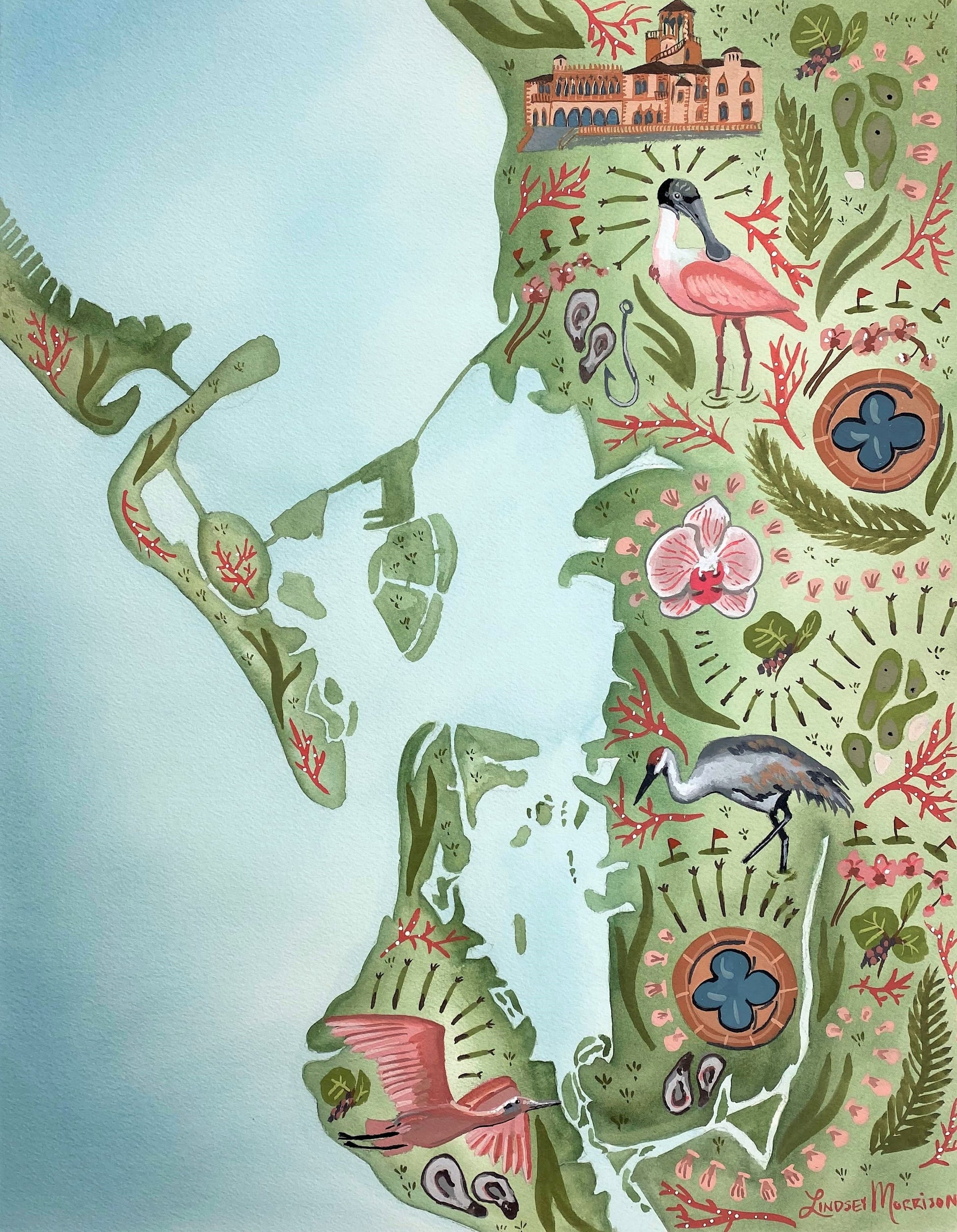 Note from the artist: "I grew up in Sarasota (go Cardinal Mooney Cougars!) so this map was so special to create. I love shopping and dinner in St. Armand's Circle, dinner at Owen's Fish Camp (note the hook!), and keeping a clear distance from sandhill cranes in our neighborhood - they're feisty! Cheers, Lindsey"
