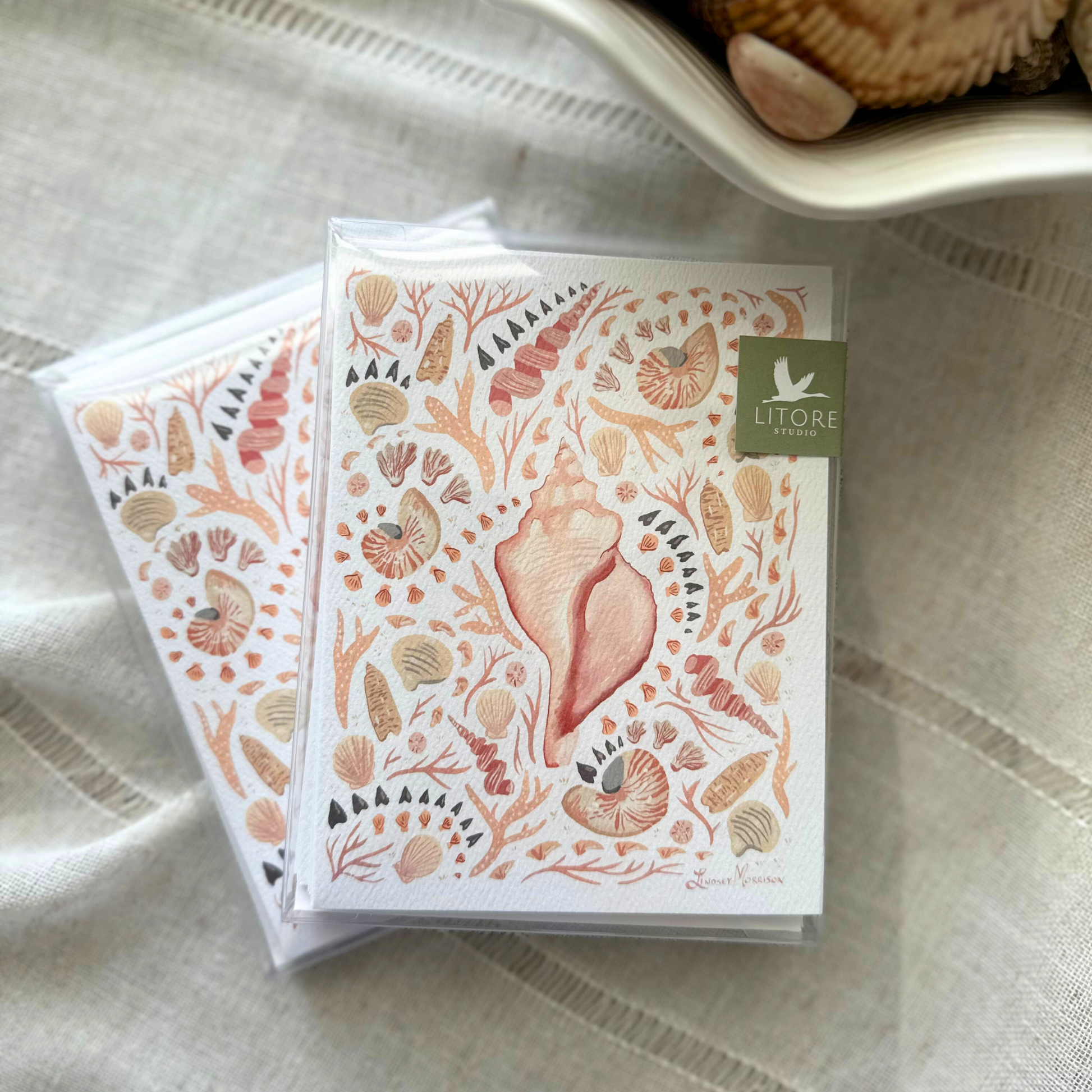 For the lovers of old Florida grace and charm, Litore Studio is proud to welcome the Shells by the Shore folded notecards to the coastal luxe stationery collection.
