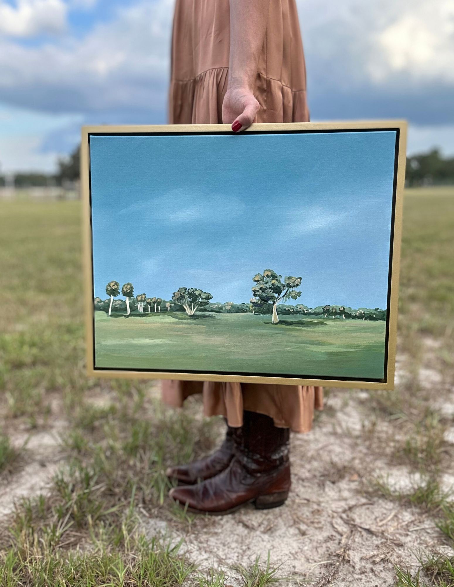 16" x 20" acrylic on gallery wrapped canvas, framed in a rustic gold wood frame.